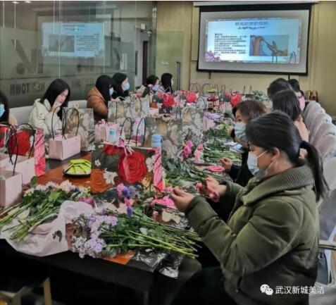 隨后,女同胞們?cè)诨ㄋ嚴(yán)蠋煹闹笇?dǎo)下發(fā)揮創(chuàng)造力,施展插花技能,結(jié)合不同的花朵色彩,一步步制作,隨著時(shí)間的流逝,一件件春意盎然、清新淡雅的插花作品隨即盛開(kāi)在女同胞們的手中。